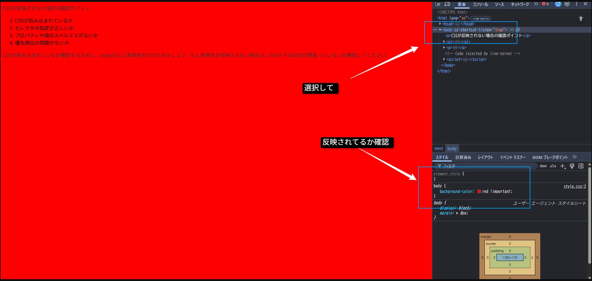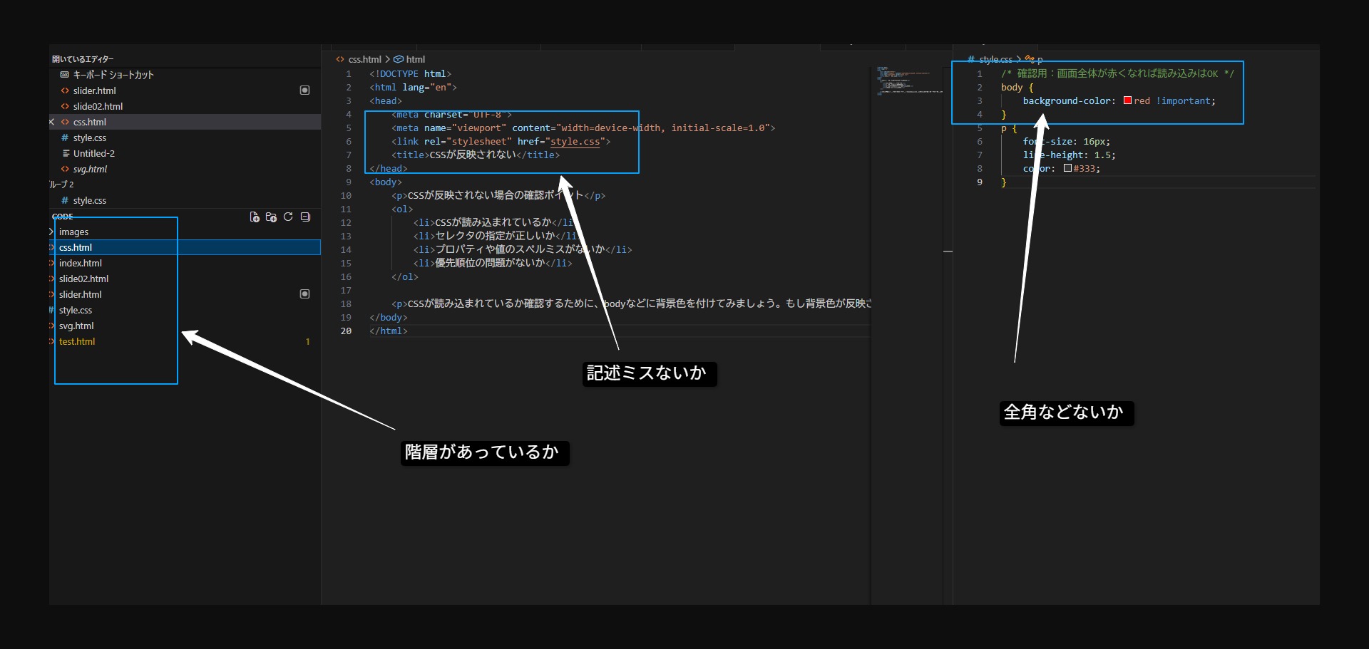 - CSS自体が読み込まれているか: linkタグの記述やパス、階層が合っているか。