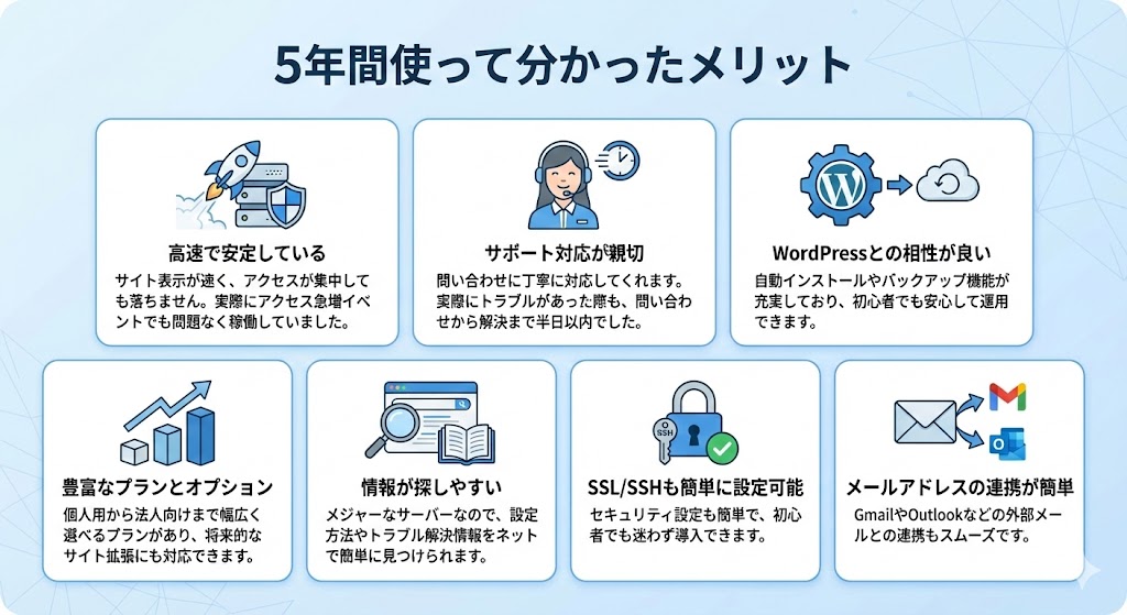 結論として、エックスサーバーの評判は本当です。私自身5年間使ってみて、速度・安定性・サポートの面で非常に満足しています。料金は少し高めですが、その価値は十分にあります。